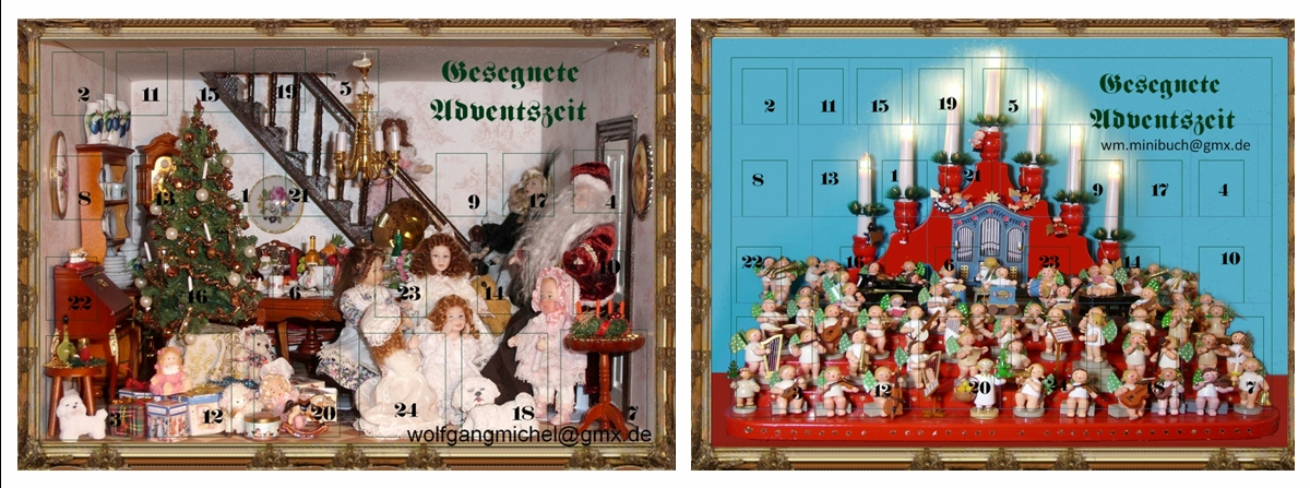 Will man ein weit größeres Projekt realisieren kann man einen Adventkalender herstellen. Die kleine Größe der Miniaturbücher verwende ich gern zur Bestückung von Adventkalendern, in jedem Jahr mit einem anderen Motiv.
