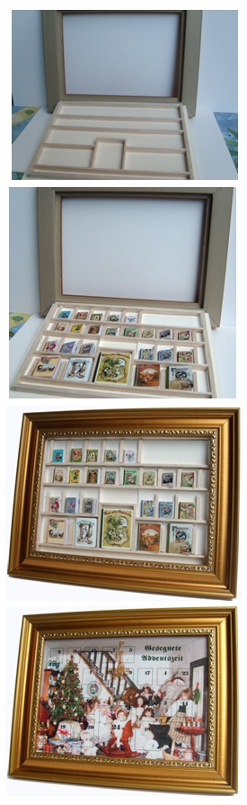 Meine Adventkalender befinden sich in einem Bilderrahmen, in dem sich hinter jedem der 24 Türchen ein Miniaturbuch befindet. So hat man in der Adventszeit jeden Tag eine kleine "Überraschung".