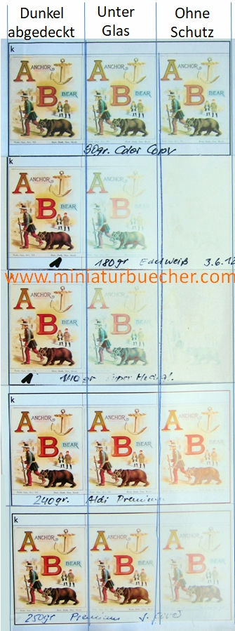 Ich habe einen Langzeitversuch laufen (seit 2010 und 2012 bis jetzt) mit unterschiedlichen Fotopapieren wo Bilder abgedeckt, unter Glas und im Freien am Fenster dem Licht ausgesetzt sind. Siehe Bilder